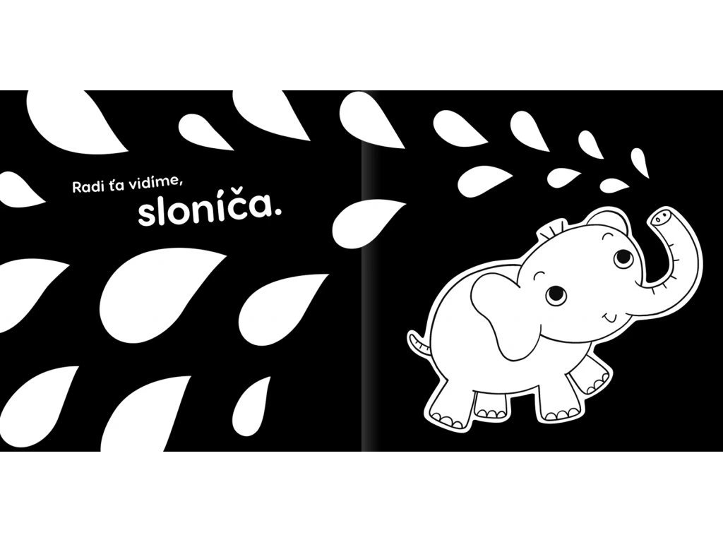 Knižka je plná roztomilých a veselých ilustrácií, ktoré zaujmú deti už od narodenia. Kontrastné čiernobiele obrázky pomáhajú stimulovať zrakové schopnosti najmenších a zároveň podporujú ich zvedavosť a pozornosť.