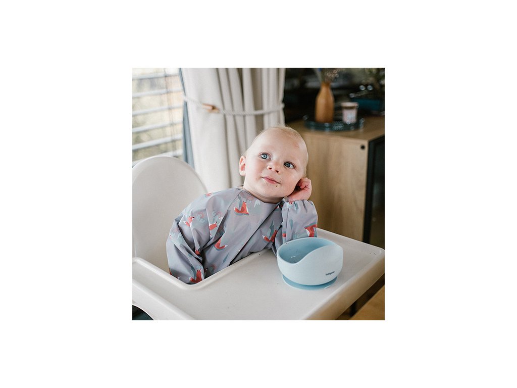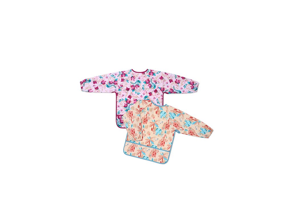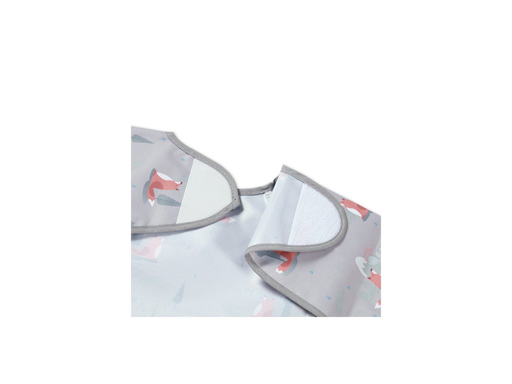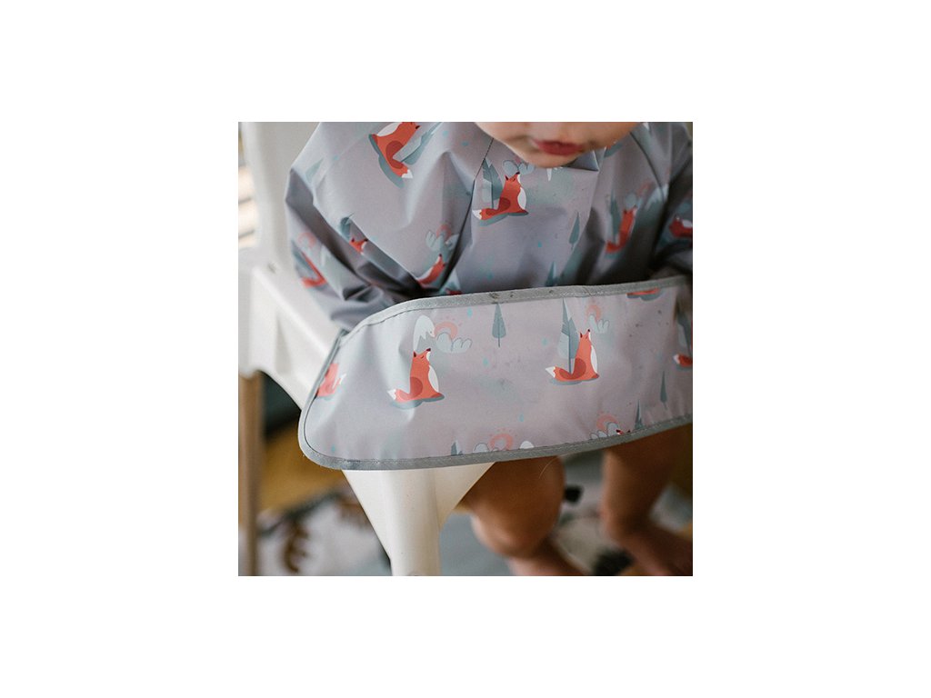 Podbradník s dlhým rukávom je šikovný pomocník, ktorý ochráni oblečenie Vášho bábätka. Počas jedenia zaisťuje prednú časť oblečenia aj rukávy, ktoré sa zvyknú zašpiniť. Vďaka pružným gumičkám dobre priľne k malým ručičkám bábätka. Podbradník s rukávmi má aj praktické vrecko na omrvinky, ktoré zachytáva zvyšky jedla. Zástera s rukávmi je vode-odolná a ľahko sa čistí, takže sa osvedčí, keď sa dieťatko učí jesť samo. Zapínanie podbradníka môžete ľubovoľne prispôsobiť veľkosti krku bábätka.Vlastnosti