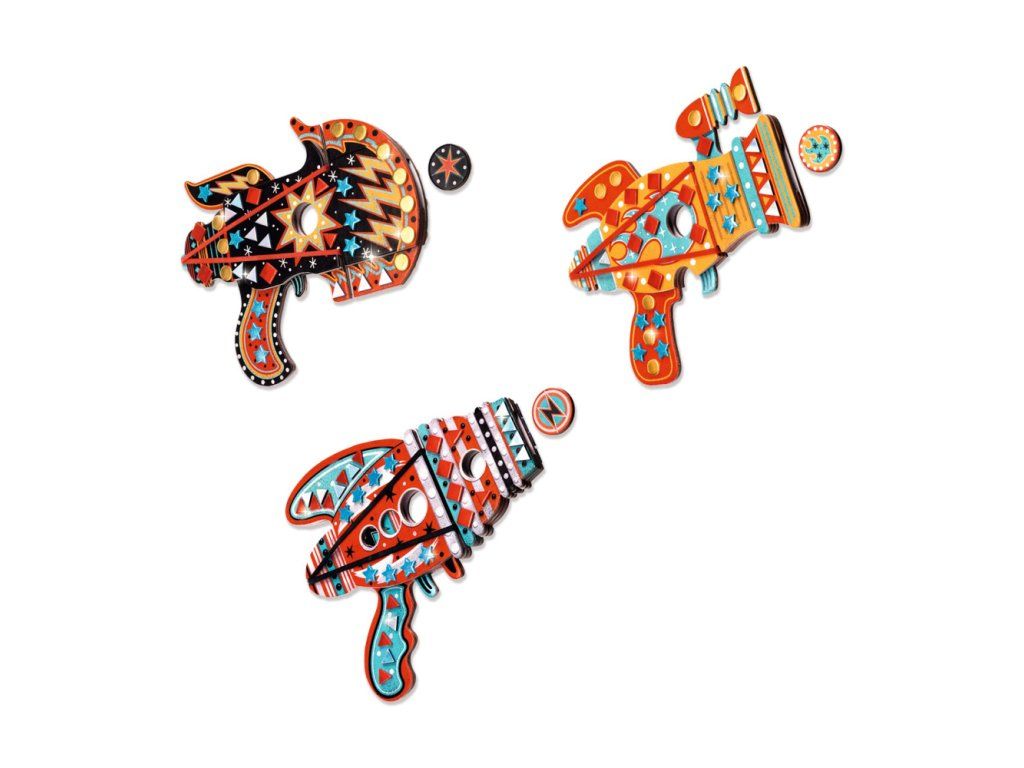 DIY Gumipušky sú tvorivá sada, v ktorej si deti pripravia 3 žetónové gumipušky z pevnej lepenky a ozdobia ich samolepiacou penovou mozaikou. Po dokončení prichádza na rad hra – gumipušky vystreľujú žetóny pomocou gumičiek, takže deti môžu trénovať presnosť a vymýšľať vlastné „misie“ a preteky.