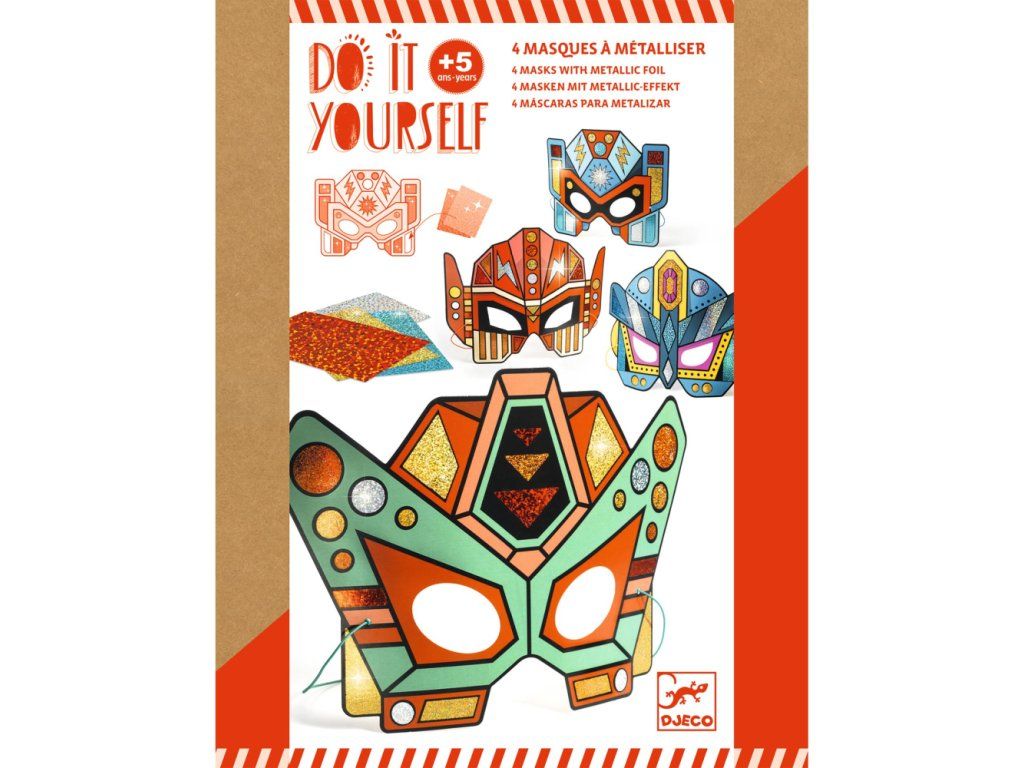 Kreatívna sada štyroch masiek super robotov na ozdobenie farebnými fóliami s metalickým leskom. Na ilustrovaných maskách sú lepivé plôšky, vďaka čomu je aktivita čistá, bez potreby použiť lepidlo. Dieťa pritlačí hárok fólie určitej farby na lepivú plôšku, hárok stiahne a plôška zostane polepená metalicky lesklou fóliou. Takto vyplní všetky plôšky.