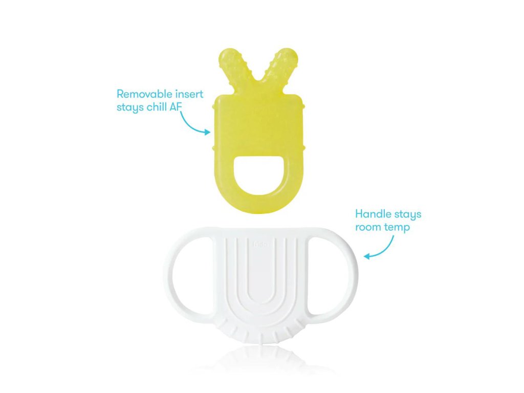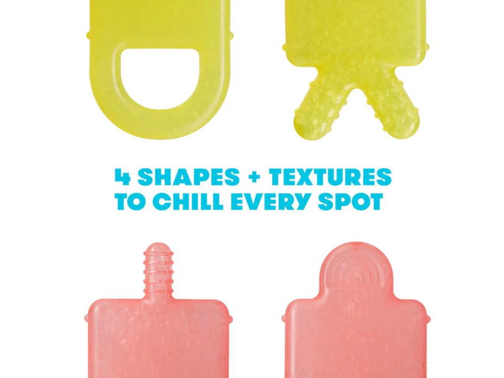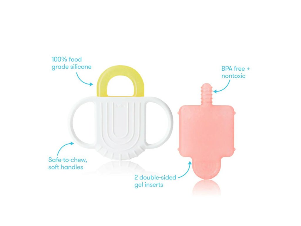 Vynechajte mrazivé krúžky na prerezávanie zúbkov a pomôžte detským ďasnám bez toho, aby im omrzli ruky. Hryzátko, ktoré nie je príliš studené na držanie, má držadlo, ktoré dieťa drží v teple, s dvoma obojstrannými, chladivými masážnymi strojčekmi na ďasná vyrobenými zo silikónu bez BPA. Každá zo štyroch strán je navrhnutá s tvarmi a textúrami pre potešenie dieťaťa zo žuvania a zároveň stimuluje ďasná v prednej a zadnej časti.