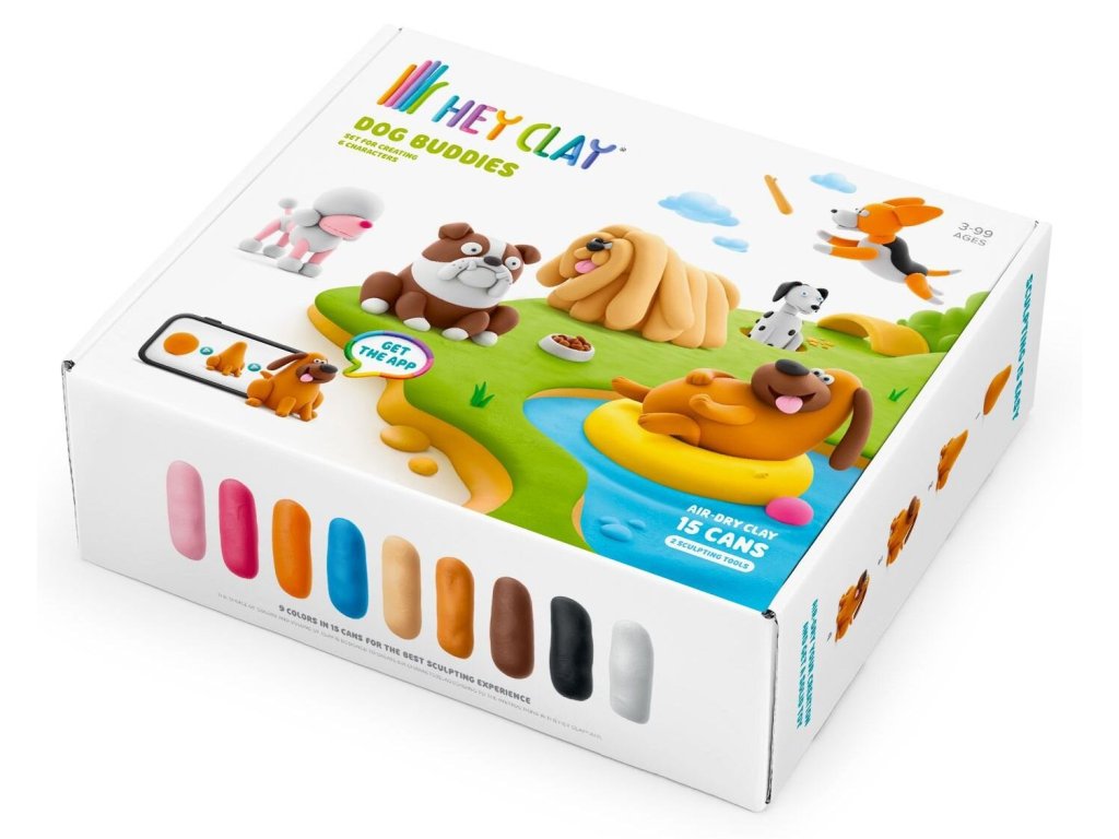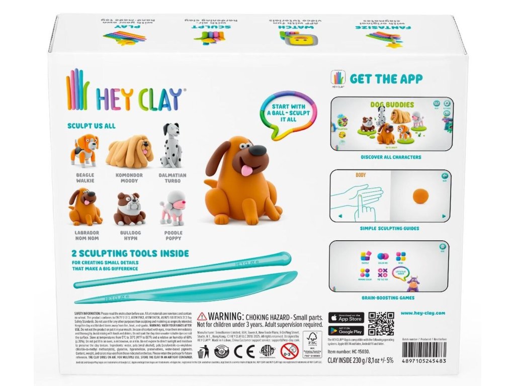 Hey Clay Psí kamaráti Vymodelujte si veselé postavičky psíkov Modelovacia hmota Hey Clay je ideálna pre všetky deti, ktoré milujú kreatívne tvorenie. Vďaka jemnej a voňavej modelovacej hmote si môžu vytvoriť originálne postavičky psíkov alebo iné rôzne figúrky, podľa vlastnej fantázie. Po vymodelovaní stačí nechať postavičky zatvrdnúť na vzduchu približne 24 hodín, čím sa premenia na pevné figúrky a sú pripravené na ďalšie dobrodružstvá a hry.Objavte inšpirácie v aplikácii a vytvorte si postavičky presne podľa návodu Sada obsahuje 15 nádobiek farebnej plastelíny a 2 plastové pomôcky pre jednoduchšie modelovanie. Navyše, prístupový kód do aplikácie umožňuje detičkám inšpirovať sa novými nápadmi a vytvoriť 6 rôzne postavičky presne podľa návodu. Ak deti nie sú so svojím výtvorom spokojné, Hey Clay môžu jednoducho uložiť späť do téglika a pokračovať v modelovaní neskôr. Deti si pri hre trénujú svoje zručnosti, jemnú motoriku a rozvíjajú fantáziu.Dodatočné parametre