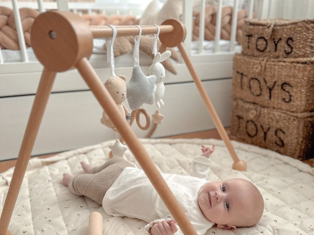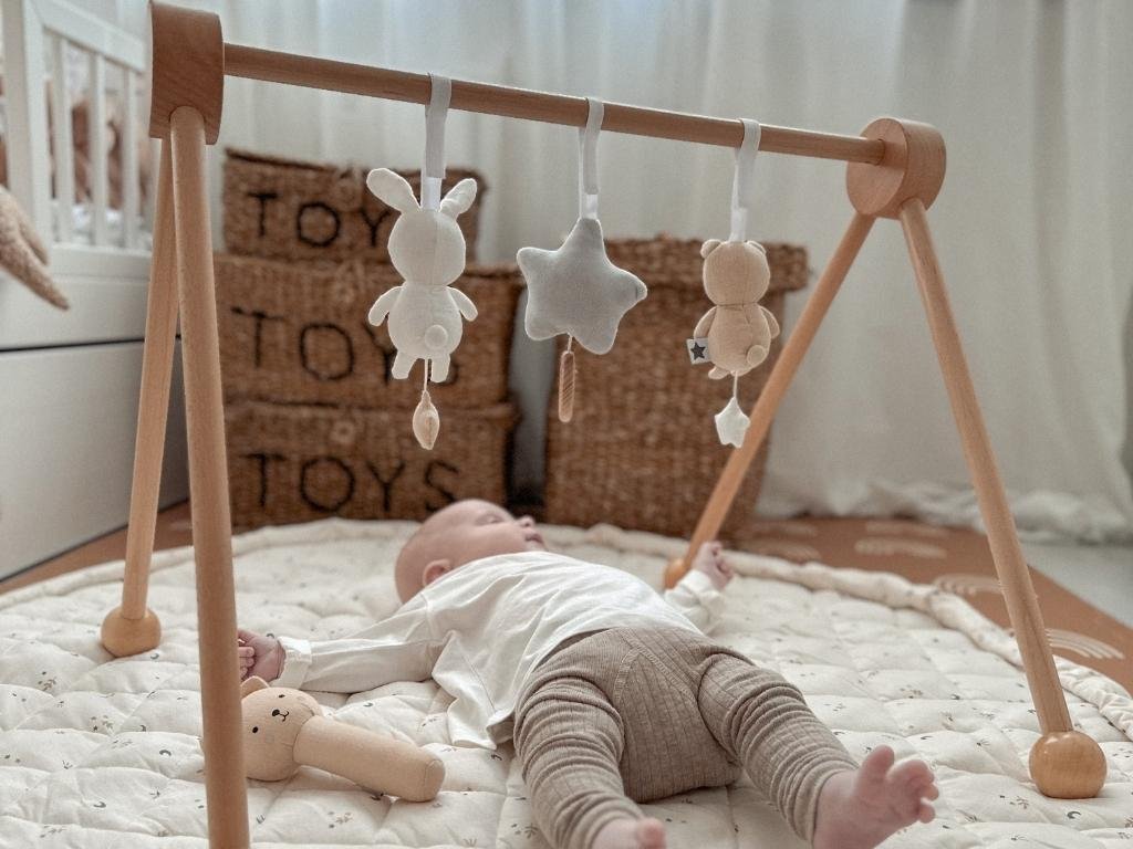 - Rozvoj koordinácie oko–ruka – zavesené hračky nad hrazdičkou podporujú úchop, sledovanie pohybu a motorickú aktivitu.