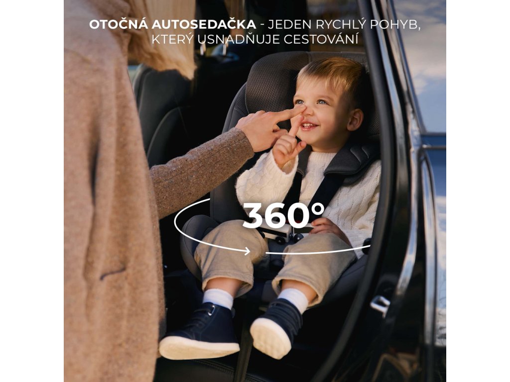 Systém EASY SPIN 360° umožňuje jednoduché otočenie sedačky smerom k dverám auta jednou rukou. Bude pre vás pohodlnejšie ukladať dieťa do autosedačky a tiež uľahčí pripútanie bábätka pomocou päťbodového vnútorného bezpečnostného pásu. Systém umožňuje rýchlu zmenu polohy z RWF na FWF bez nutnosti vyberať autosedačku z auta.