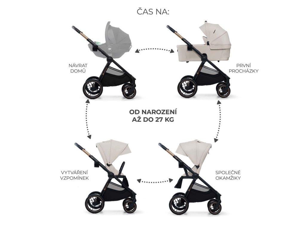 - Od narodenia do 22 kg – kočík má veľkú vaničku s mäkkým matracom, ktorú môže dieťa používať do 9 kg alebo do chvíle, keď sa začne prevracať. Sedadlo kočíka je možné namontovať smerom dopredu alebo dozadu voči smeru jazdy.