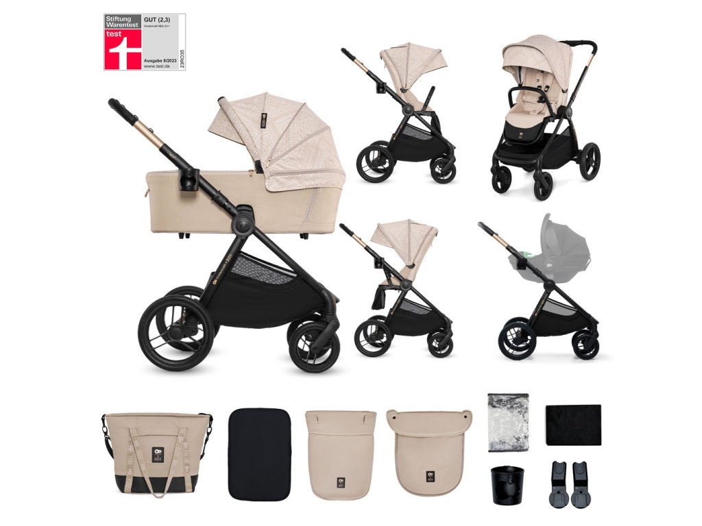 - Sada praktického príslušenstva: univerzálne adaptéry na autosedačku, nánožník pre vaničku a športovú časť, matrac do vaničky, držiak na pohár, pláštenka, sieťka proti hmyzu a nová prebaľovacia taška.