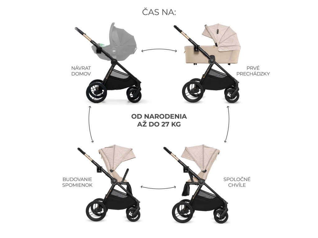 - Od narodenia do 22 kg – kočík má veľkú vaničku s mäkkým matracom, ktorú môže dieťa používať do 9 kg alebo do chvíle, keď sa začne prevracať. Sedadlo kočíka je možné namontovať smerom dopredu alebo dozadu voči smeru jazdy.
