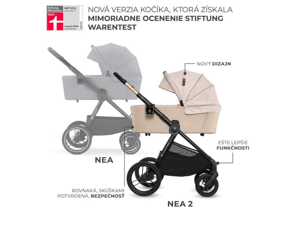 Toto je NEA 2 - multifunkčný kočík 2v1, ktorý vzbudí váš záujem kompaktným dizajnom a kolesami do každého terénu. Veľké kolesá vám bez väčších problémov umožnia prekonať vysoké obrubníky, či nerovné mestské chodníky. NEA 2 je odpoveďou na potreby moderných rodičov, ktorí hľadajú stabilný, pevný, no napriek tomu dobre ovládateľný kočík. Okienko na strieške vám umožní jednoduchú kontrolu, či batoľa počas prechádzky zaspalo, a keď sa náhodou stane, že dieťa kočík zašpiní - poťah na pranie ľahko stiahnete. Brzda STOP & RIDE umožňuje ľahké zaistenie a odistenie kočíka a jednoduchý systém skladania a praktické riešenia ako sú SELF STANDING alebo AUTO LOCK uľahčujú prepravu a skladovanie.