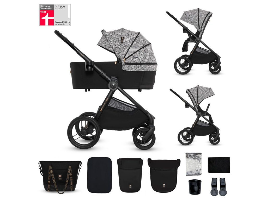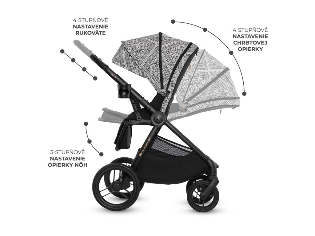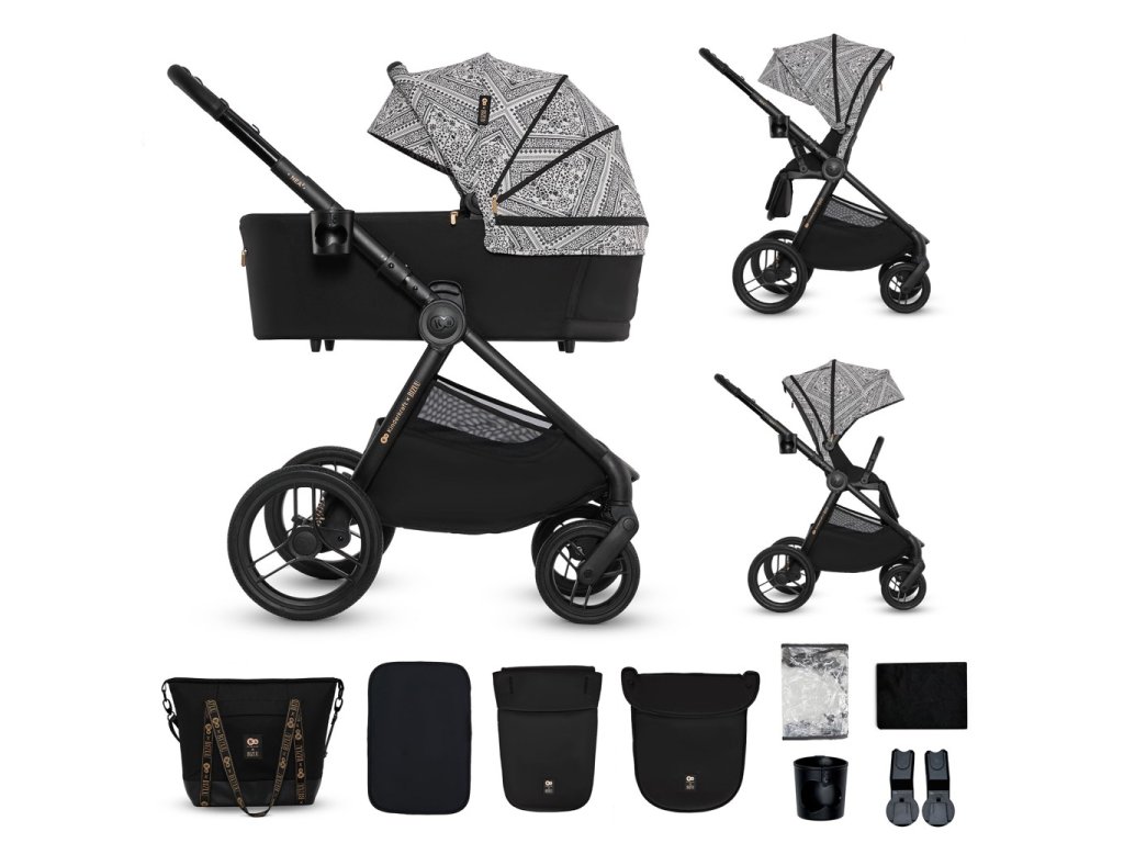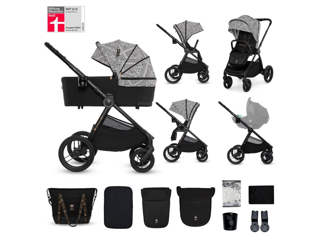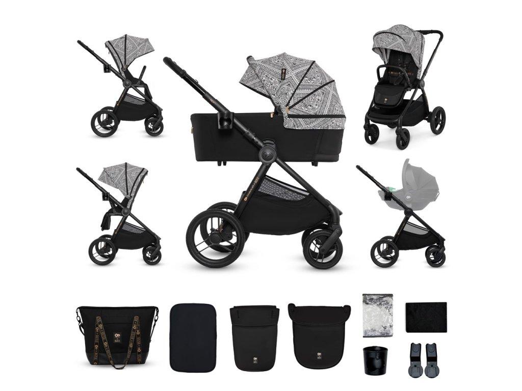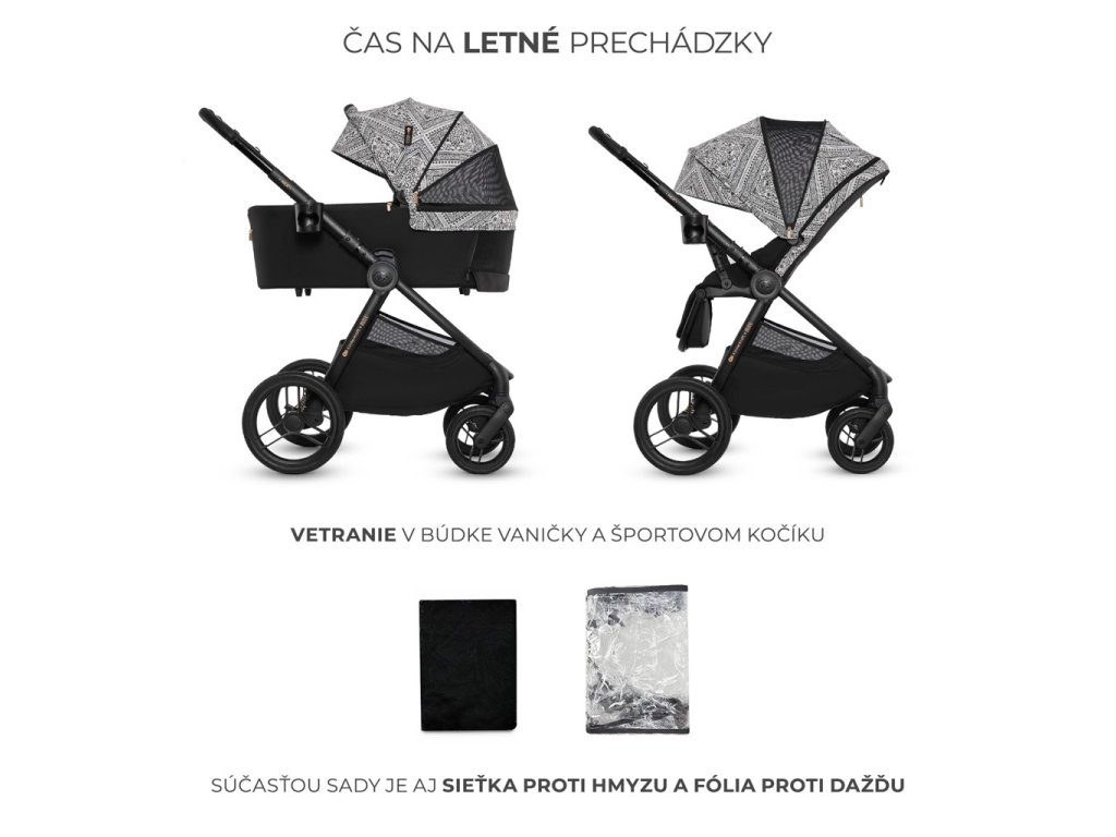 - Sada praktického príslušenstva: univerzálne adaptéry na autosedačku, nánožník pre vaničku a športovú časť, matrac do vaničky, držiak na pohár, pláštenka, sieťka proti hmyzu a nová prebaľovacia taška.