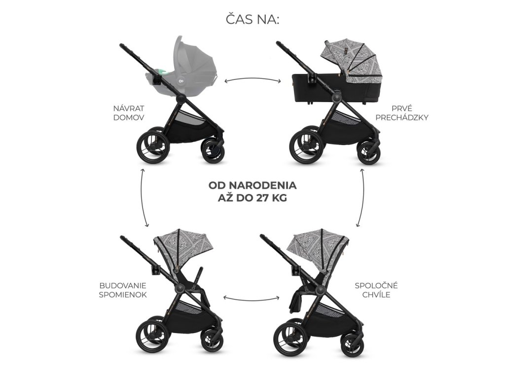 - Od narodenia do 22 kg – kočík má veľkú vaničku s mäkkým matracom, ktorú môže dieťa používať do 9 kg alebo do chvíle, keď sa začne prevracať. Sedadlo kočíka je možné namontovať smerom dopredu alebo dozadu voči smeru jazdy.