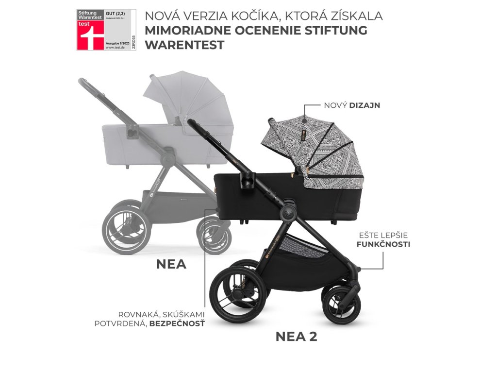 Toto je NEA 2 - multifunkčný kočík 2v1, ktorý vzbudí váš záujem kompaktným dizajnom a kolesami do každého terénu. Veľké kolesá vám bez väčších problémov umožnia prekonať vysoké obrubníky, či nerovné mestské chodníky. NEA 2 je odpoveďou na potreby moderných rodičov, ktorí hľadajú stabilný, pevný, no napriek tomu dobre ovládateľný kočík. Okienko na strieške vám umožní jednoduchú kontrolu, či batoľa počas prechádzky zaspalo, a keď sa náhodou stane, že dieťa kočík zašpiní - poťah na pranie ľahko stiahnete. Brzda STOP & RIDE umožňuje ľahké zaistenie a odistenie kočíka a jednoduchý systém skladania a praktické riešenia ako sú SELF STANDING alebo AUTO LOCK uľahčujú prepravu a skladovanie.