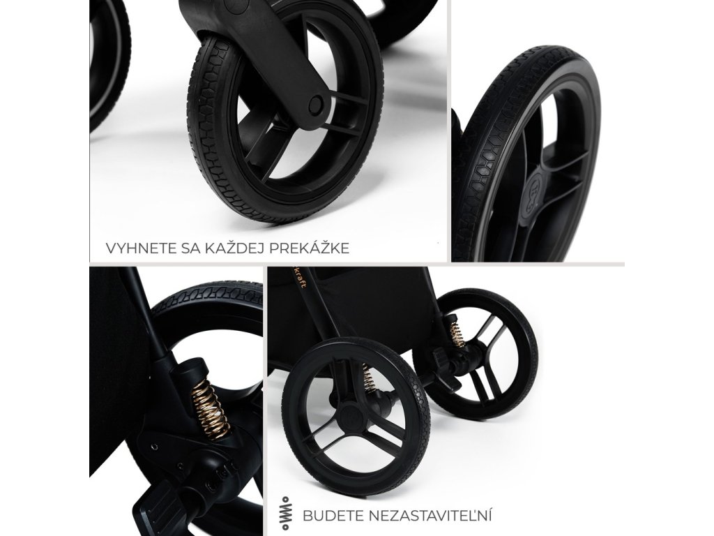 - Veľké kolesá s tlmičmi nárazov umožňujú jednoduché zdvihnutie kočíka a nevyžadujú pumpovanie.