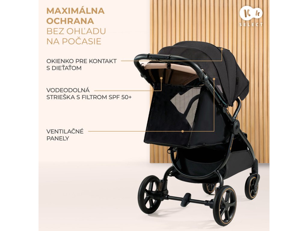 MITZY ochráni Vaše dieťa počas prechádzky - veľká, nepremokavá strieška má filter UPF50+, ktorý Vaše dieťatko ešte viac ochráni pred UV žiarením. Má vetrací panel na vetranie počas horúčav a okienko na kontakt s dieťaťom. Vietor, dážď - ani to nie je pre tento kočík žiadny problém.