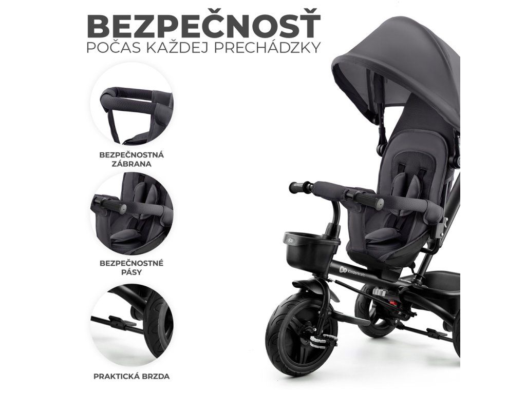 Trojkolka je vybavená nastaviteľnými, 3-bodovými bezpečnostnými pásmi a bezpečnostnou zábranou. Pásy majú mäkké chrániče a rozkrokový popruh sa dá jednoducho pripevniť k zábrane, aby sa zvýšila bezpečnosť vášho dieťaťa.