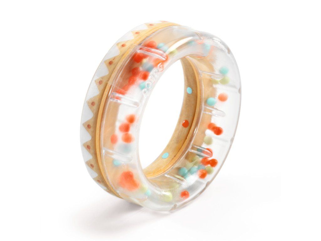 Dreveno-plastová koliesková presýpacia hrkálka. Pri trasení a otáčaní hrkálkou sa malé guľôčky presýpajú cez prekážky. Vzniká príjemný zvuk pripomínajúci ľahký dážď. Bábätko môže pohyb guľôčok sledovať. Hrkálka sa dobre drží, dá sa aj kotúľať a dokonca navliecť bábätku na zápästie. Stimuluje sluch, zrak a motoriku rúk.