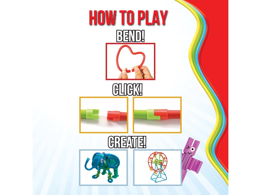 Kreatívna a flexibilná stavebnica pre deti Spaghetteez 34 ks od belgickej značky Clics Toys prináša neobmedzené možnosti tvorby a umožňuje deťom vytvoriť najrôznejšie 2D aj 3D figúrky. Balenie obsahuje rôzne dĺžky flexibilných dielikov v červenej farbe, ktoré pripomínajú špagety, spolu s ďalšími konštrukčnými prvkami a návodom na tvorbu úžasných modelov. Vďaka špeciálnemu zaklikávaciemu systému na koncoch sa dieliky ľahko spoja – stačí ich spojiť, otočiť a môžete ich začať ohýbať a modelovať.
