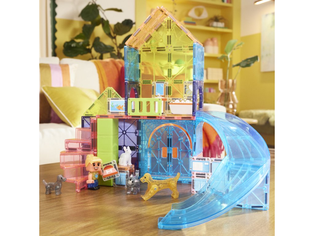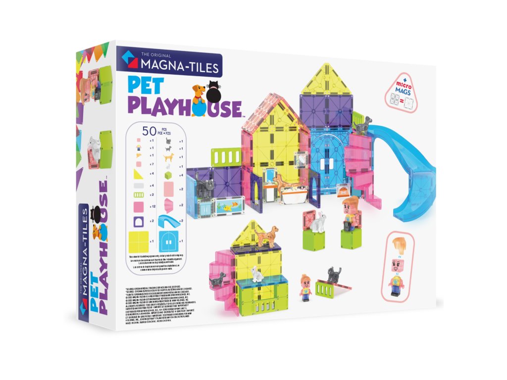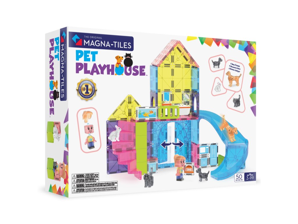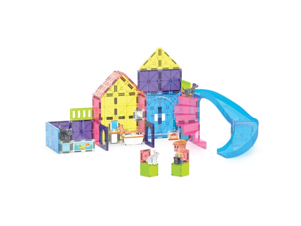 Magnetická stavebnica Pet Playhouse 50 dielovPostav domček pre svojich miláčikov a vytvor svet plný radosti a objavov!Vitaj vo svete, kde sa chlpatí kamaráti stávajú hlavnými hviezdami hry! So stavebnicou MAGNA-TILES® Pet Playhouse si deti vytvoria útulný domov pre psíkov, mačičku aj zajačika – plný preliezačiek, šmykľaviek a nekonečnej zábavy. Čo robí túto stavebnicu výnimočnou?4 roztomilé figúrky domácich zvieratiek – pripravené na dobrodružstvo aj mojkanie.Nový dielik šmykľavky a otváracie dvere – viac možností, viac zábavy!Mix & Match figúrka opatrovateľa zvierat – deti si vytvoria vlastného ošetrovateľa podľa seba.Plne kompatibilná s ostatnými sadami Magna-Tiles® – Viac dielov = viac možností.Prečo si ju deti aj rodičia zamilujú?Podporuje kreativitu a samostatnosť – Stavanie bez návodu? Áno, prosím!Rozvíja jemnú motoriku, koordináciu ruka-oko a logiku – Učenie hrou nebolo nikdy zábavnejšie.Perfektný darček pre malých dobrodruhov – Odporúčané pre deti od 3 rokov.Bezpečné a odolné prevedenie – Sú vyrobené tak, aby vydržali nespočetné hodiny hrania a neobsahujú BPA, ftaláty ani latex.Navrhnuté pre zmysluplnú hru – Bez potreby asistencie dospelých, len čistá radosť.Dodatočné parametre