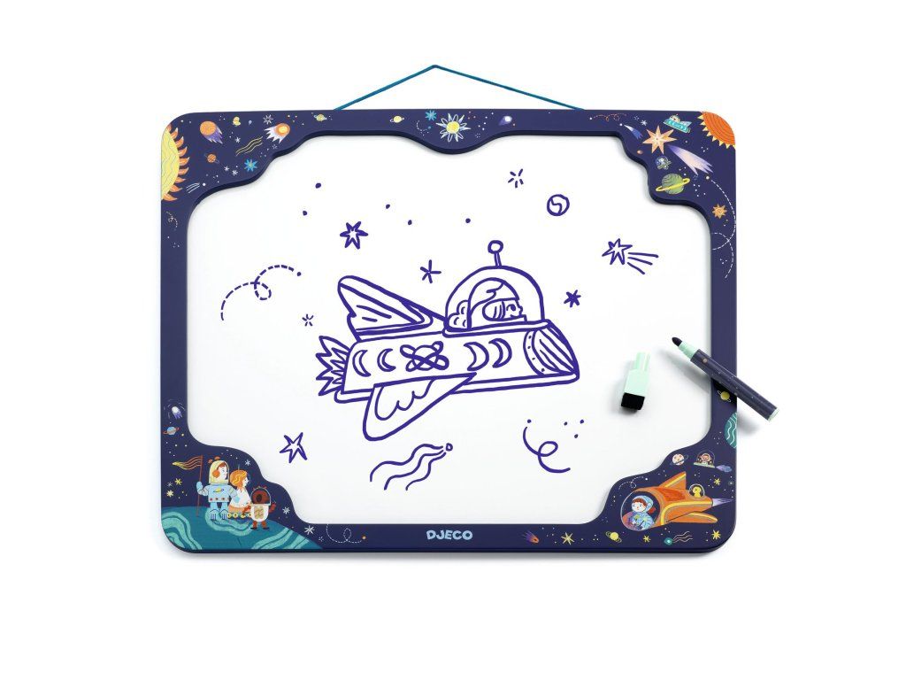 Magnetická tabuľka Vesmír je praktická nástenka aj kresliaca plocha v jednom.Má kovový magnetický povrch v pevnom drevenom ráme a vďaka šnúrke na zavesenie sa hodí na stenu do detskej izby, predsiene či kuchyne.Deti na ňu môžu písať a kresliť stierateľnou fixkou a ty si na ňu ľahko pripneš odkazy, rozvrh alebo obrázky pomocou magnetiek.