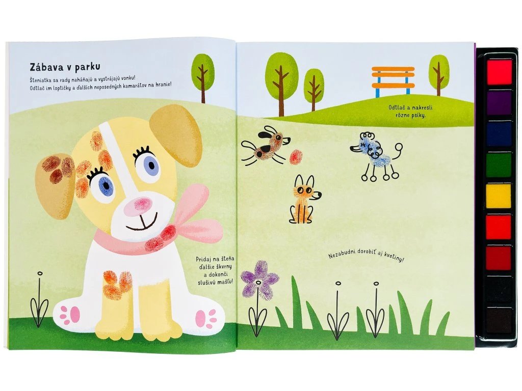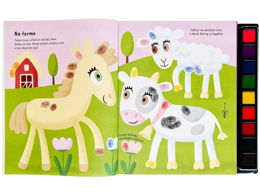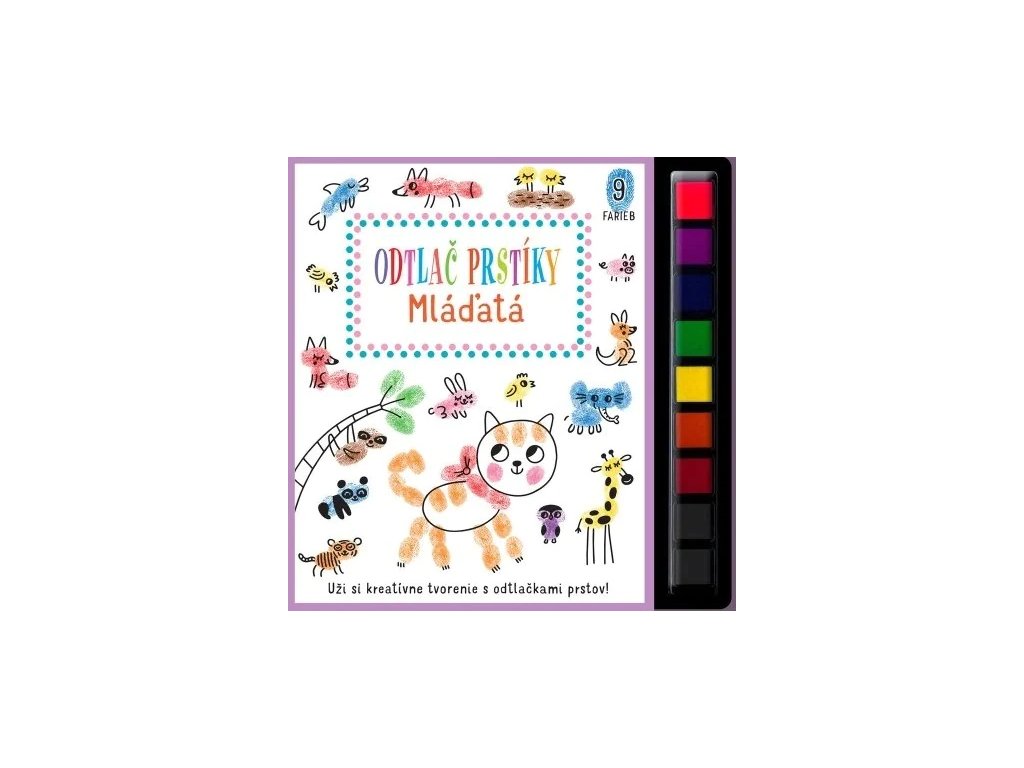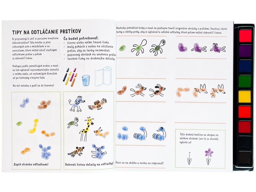 Táto kreatívna kniha obsahuje mnoho nápadov a návodov na vytvorenie zábavných obrázkov pomocou farebných odtlačkov prstíkov. Na každej stránke so zvieratami z celého sveta sa môžeš umelecky vyjadriť a obrázky zaplniť aj podľa svojej vlastnej fantázie. Hotové odtlačky môžeš dokončiť pomocou fixky a pridať im drobné, nápadité detaily. Rôzne prsty robia rôzne odtlačky, tak na nič nečakaj a pusť sa do tvorenia!