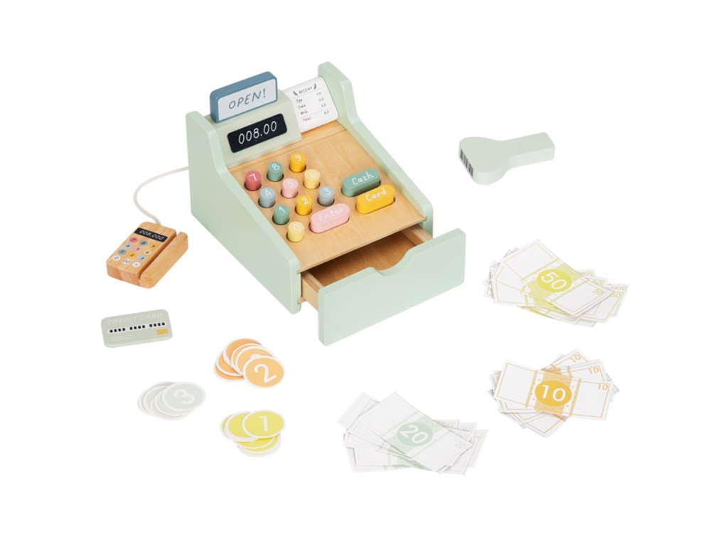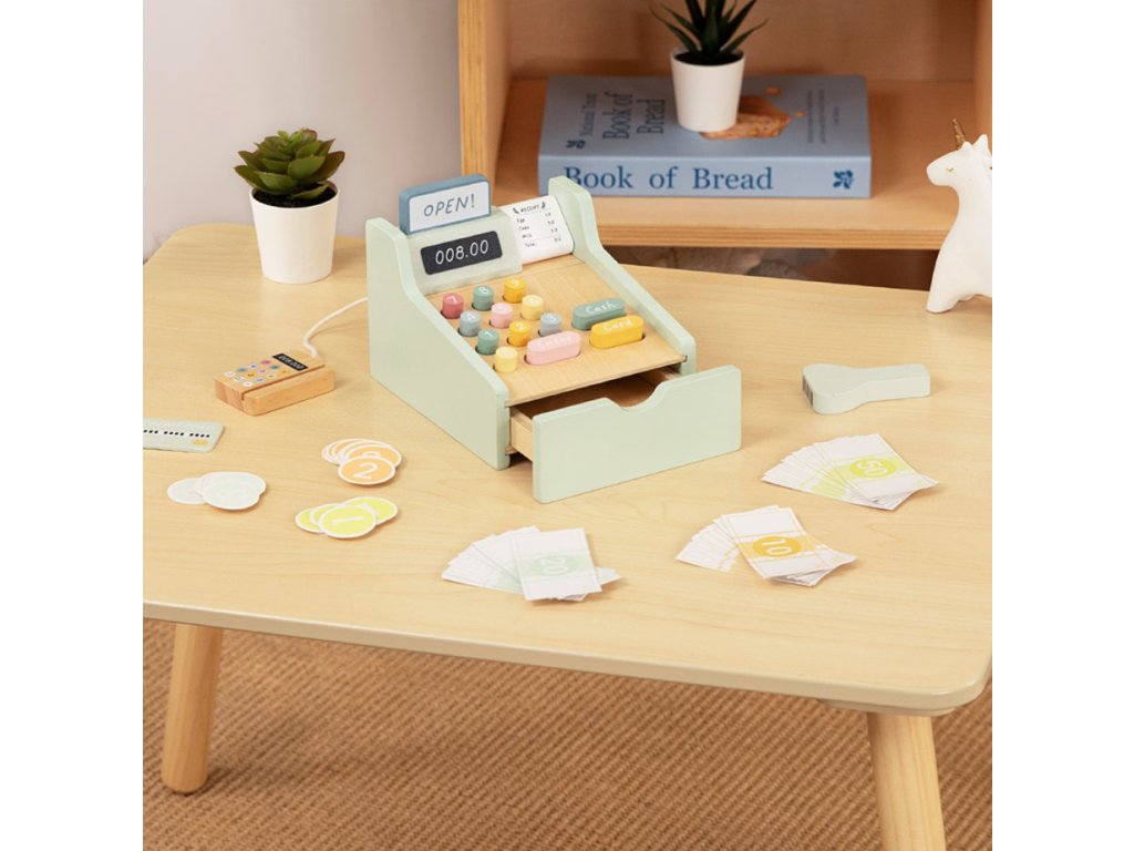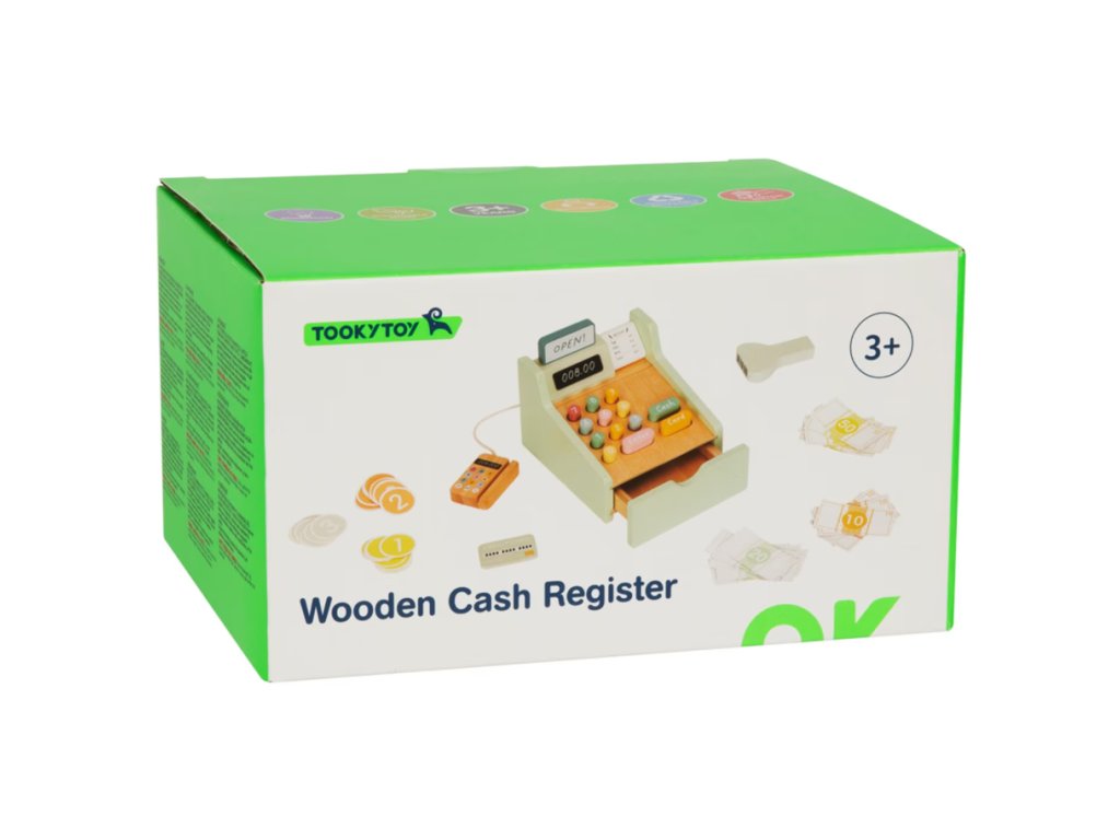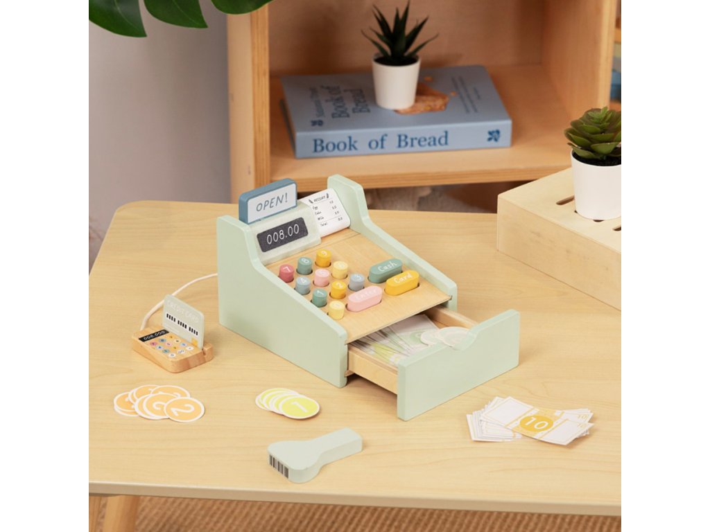 Drevená pokladňa s čítačkou kariet a skenerom od Tooky Toy prináša deťom realistický zážitok z hry na obchod – presne ako v skutočnosti. Deti môžu prijímať platby kartou, skenovať tovar, vydávať účtenky a počítať peniaze. Každé „pípnutie“ skenera prináša novú dávku zábavy a učenia hravou formou. Táto pokladňa je ideálnou hračkou pre malých predavačov, ktorí radi objavujú svet dospelých.