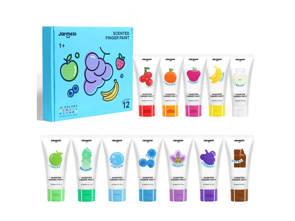 - 12 umývateľných farieb + príjemné vône (napr. čerešňa, banán, jahoda, hrozno, pomaranč...) pre multizmyslovú hru