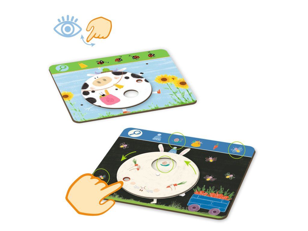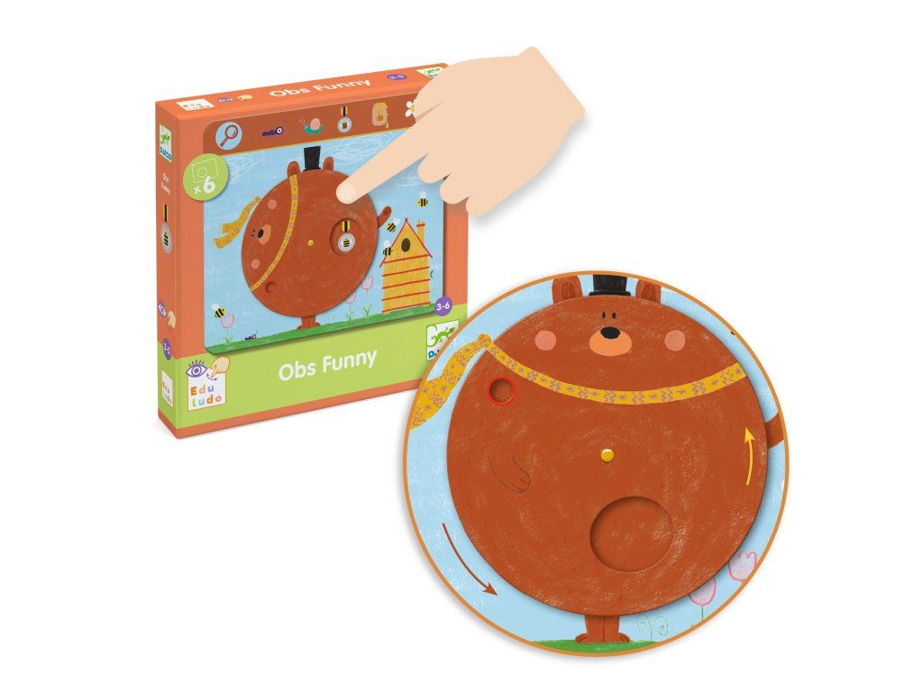 Prvá hľadacia hra Obs Funny je hravá „hľadaj a nájdi“ aktivita pre najmenšie deti, kde sa učia pozorne pozerať a všímať si detaily.Na každej z 6 hracích dosiek je otočný prvok, ktorým dieťa hýbe prstami – a tak si postupne odkrýva zvieratká a predmety, ktoré má nájsť.