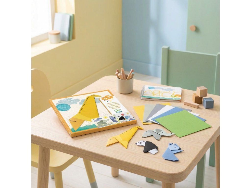 Prvé origami – 1, 2, 3… poskladané! je jednoduchá a vedená aktivita skladania papiera pre deti, ktorá ich hravo zoznámi s prvými origami krokmi.Dieťa vždy poskladá 3 papierové listy – línie ohybov sú už vytlačené priamo na papieri, takže skladanie je prehľadné a ľahké aj pre začiatočníkov.Hotové zvieratko potom dieťa zloží do celku a pomocou penových obojstranných samolepiek ho prilepí na pripravené pozadie – vznikne tak 5 krásnych 3D obrázkov.