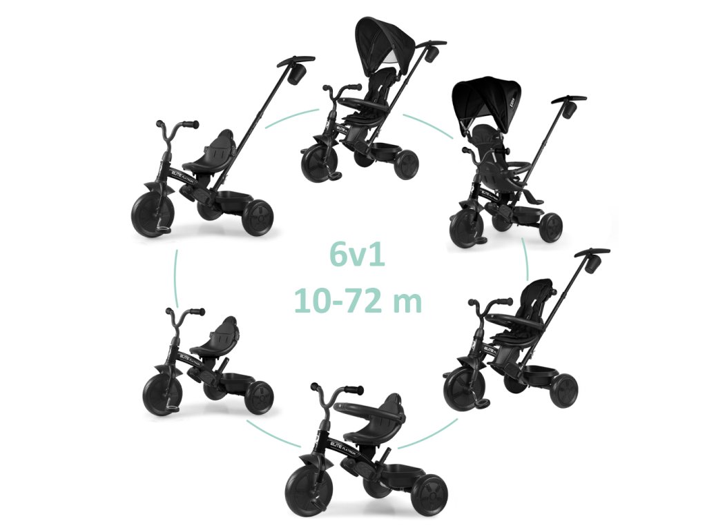 - 6v1 funkcia - Tento model ponúka 6 rôznych možností, ako trojkolku používať, od kočíka, ktorý riadi rodič, až po samostatnú jazdu na bicykli. Trojkolka je ideálna pre deti od 10 mesiacov až do 72 mesiacov.