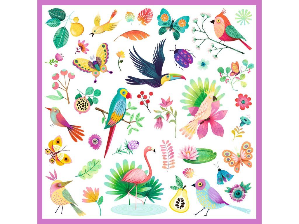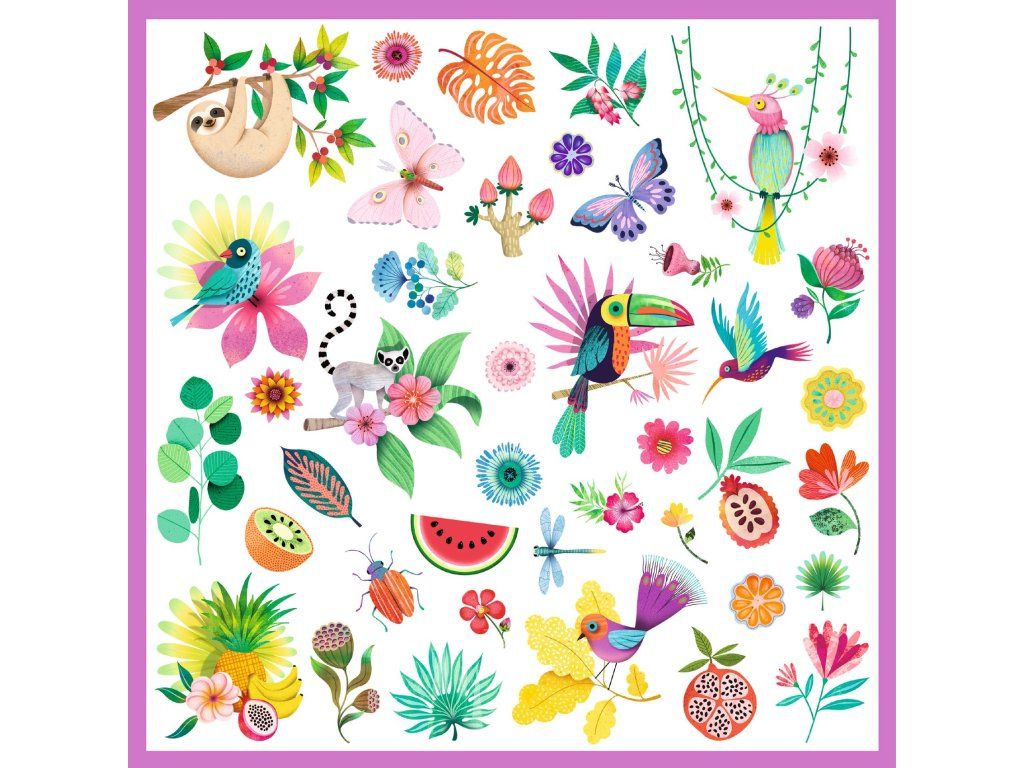 - Vyber si samolepky a vymysli scénu (pláž, džungľa, tropická záhrada).