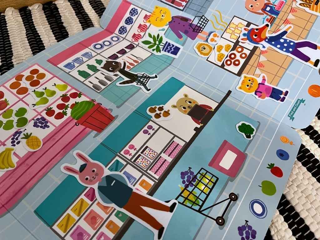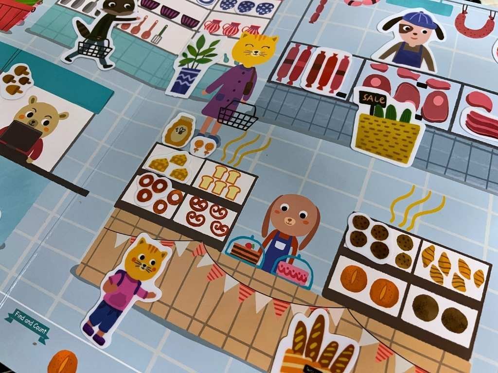 Táto súprava znovu použiteľných silikónových samolepiek prenesie deti do supermarketu plného zvieratiek a potravín. Obsahuje rozkladací obojstranný podklad s motívom obchodu a 41 samolepiek, ktoré môžu deti ľubovoľne prelepovať a vytvárať tak nové príbehy. Samolepky sa dajú pripevniť aj k obrysom s anglickými názvami – hravo tak rozvíjajú aj slovnú zásobu.