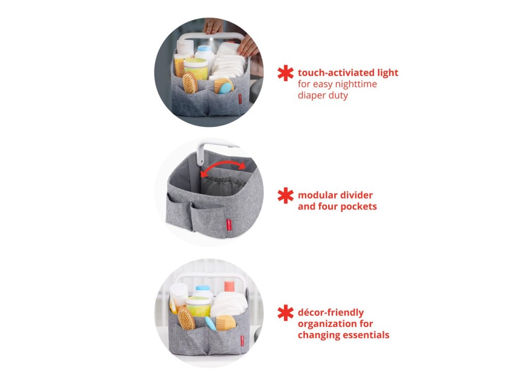 Moderná taška pre hygienické potreby Vám všetko uľahčí. Usporiadajte si plienky, obrúsky a ďalšie potrebné veci do oddelených častí tašky, ktoré krásne vytvoria zorganizovaný priestor a všetko bude pre Vás ľahko dostupné. Rovnako taška je doplnená o nočné svetlo, ktoré Vám bude veľmi nápomocné v noci. Rukoväť svieti jemne s dotykovým svetlom a funkciou automatického vypnutia po 10 minútach.Vlastnosti: