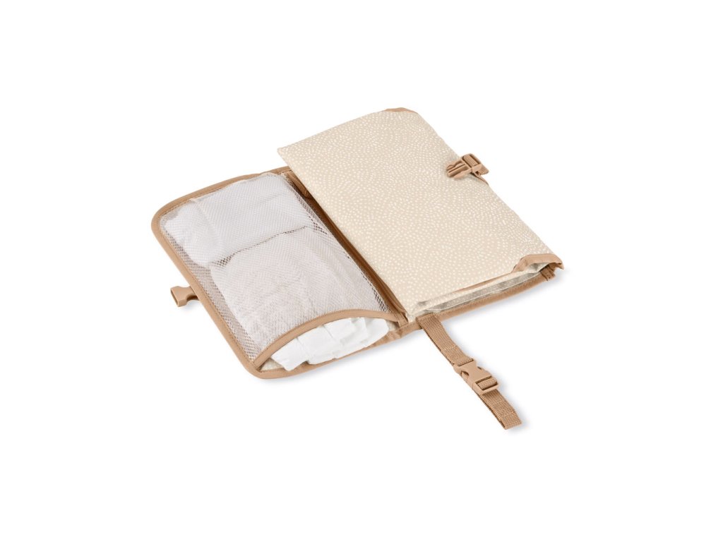Dokonalá pomôcka na prebaľovanie uľahčuje prebaľovanie detí bez ohľadu na to, kde sa práve nachádzate. Set obsahuje mäkkú podložku na prebaľovanie s možnosťou odopnutia pomocou zipsu a samostatnú taštičku na hygienické potreby ako plienky, obrúsky, krém. Do veľkého sieťovaného vrecka sa zmestia až štyri plienky plus krémy a ďalšie potrebné veci. Predné vrecko na zips je ideálne na kľúče, mobilný telefón alebo iné osobné veci. Pronto jednoducho vložte do tašky, pripnite si ho na zápästie alebo ho pripnite na kočík a vyrazte!Vlastnosti