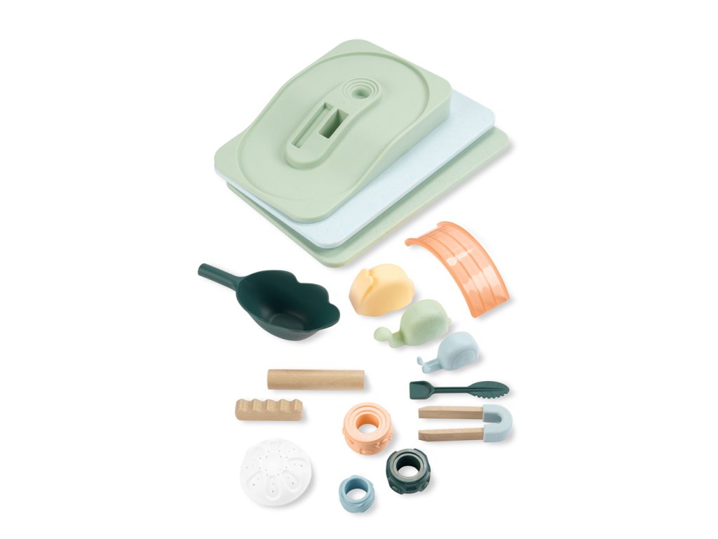 - Obsah balenia: Stôl, 2 boxy s obojstranným vekom, 14 doplnkov (formičky, naberačka, pinzeta...)