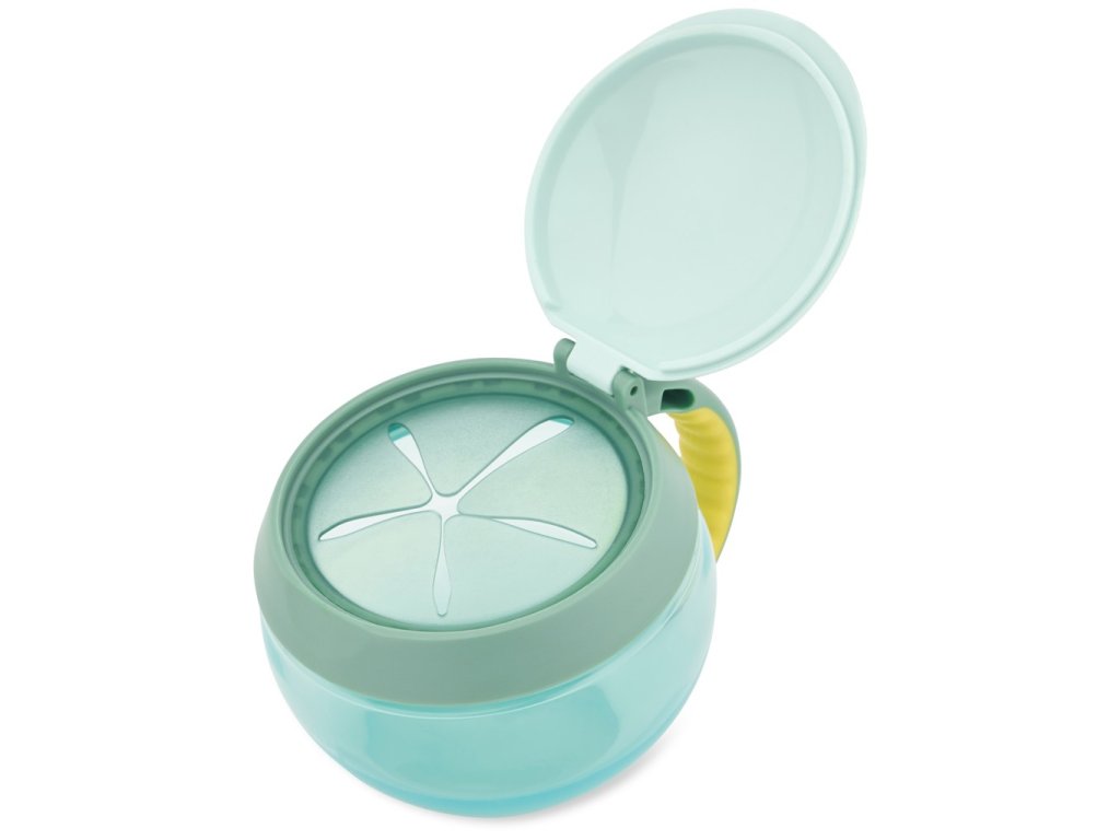 Šikovný nápad na cesty. Nádoba má viečko, ktoré po otvorení drží, pred vysypaním obsahu ho chránia pružné lamely, ktoré pustia detskú ručičku dovnútra, ale nepustia desiatu von. Nádoba je priehľadná, aby sa mohla zavčasu doplniť. Na boku je praktické uško v detskom rozmere, pomocou ktorého možno nádobu pripevniť aj na kočík či tašku. 0% BPA, 0% PVC, bez ftalátov. Obsah: 222 ml. Priemer: 10 cmRozmery produktu: 12 cm x 9,4 cm x 8,8 cm
