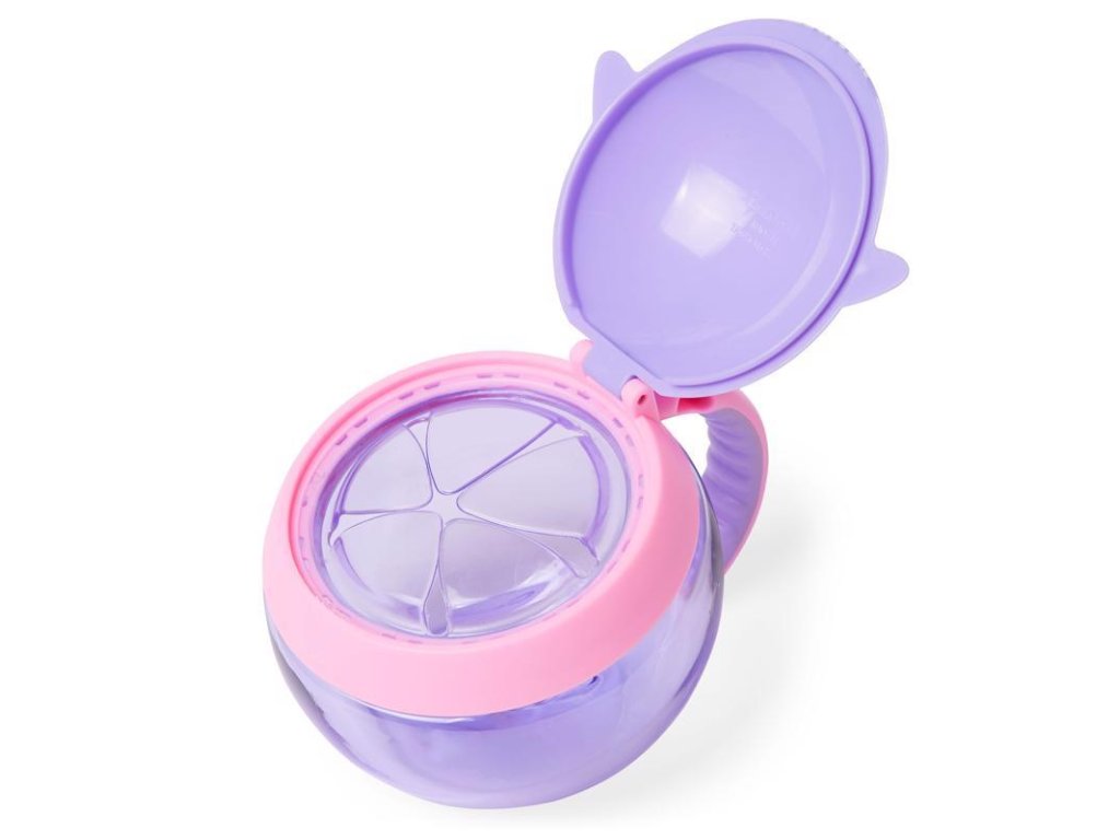 Šikovný nápad na cesty.Nádoba má viečko, ktoré po otvorení drží, pred vysypaním obsahu ho chránia pružné lamely, ktoré pustia detskú ručičku dovnútra, ale nepustia desiatu von. Nádoba je priehľadná, aby sa mohla zavčasu doplniť. Na boku je praktické uško v detskom rozmere, pomocou ktorého možno nádobu pripevniť aj na kočík či tašku.